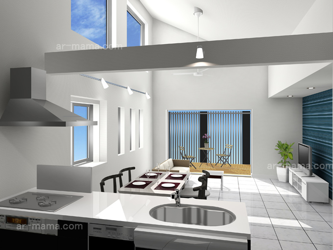 アズ・プランニングさまからのご依頼。住宅リビングの内観パースです。キッチンから空間全体を見せたいとのご要望で、吹き抜けの大きな窓が空間を明るくしています。 全開口サッシで、開け放し状態で、外部であるバルコニーも描きました。内観パースで、空間の外を描き込むのは意外と難しいです。